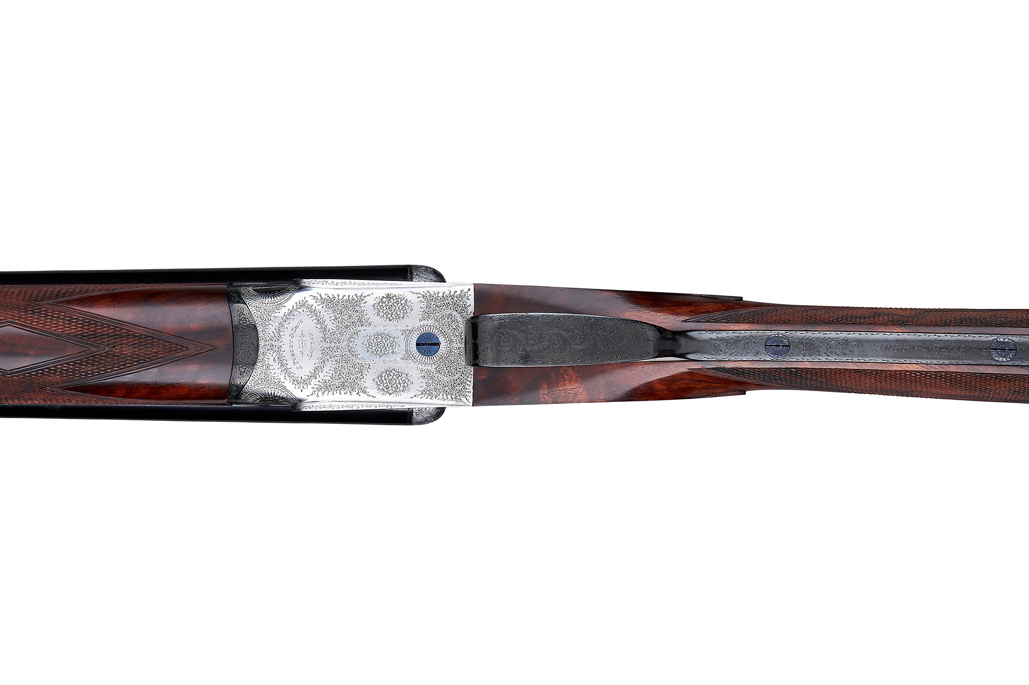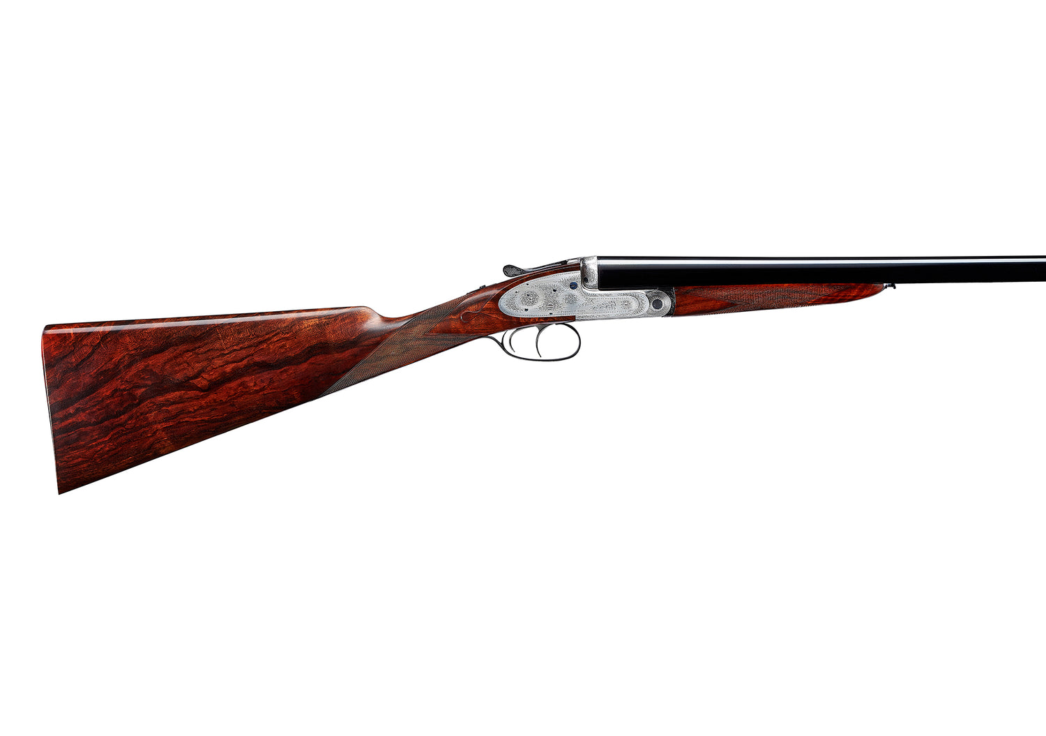 Completed in 1931, this gun has been finely engraved with our traditional rose and scroll pattern. The lockplates have cocking-indicators, and the square-bar action body has a silver finish. The double triggers have a flat trigger-guard, the highly-figured stock (replaced by ourselves in 2019) has a straight-hand grip, gold oval, and chequered heel. The barrels (replaced by ourselves in 2019) have a game-rib.